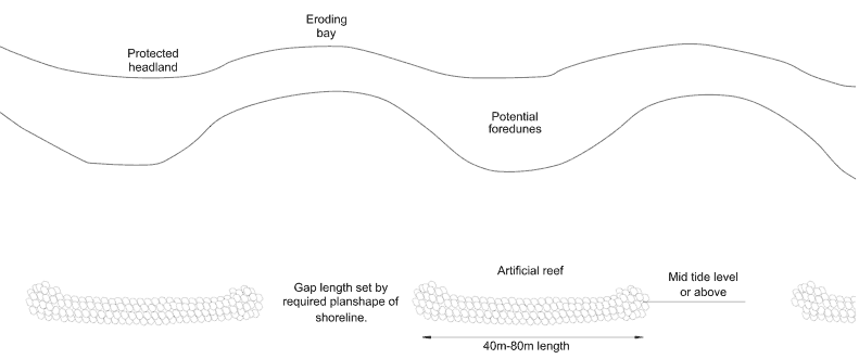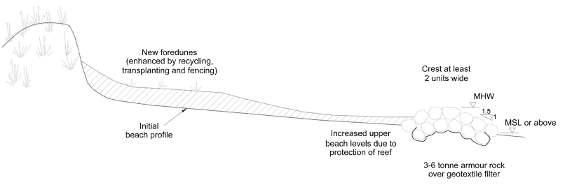 Artificial reefs are shore parallel rock mound structures set part way down the beach face. They may be long single structures or form a series of reefs extending for some distance alongshore. They are submerged for at least part of the tidal cycle, and are therefore less intrusive on the coastal landscape, have less impact on upper beach longshore processes and add a new intertidal habitat to sandy foreshores.
