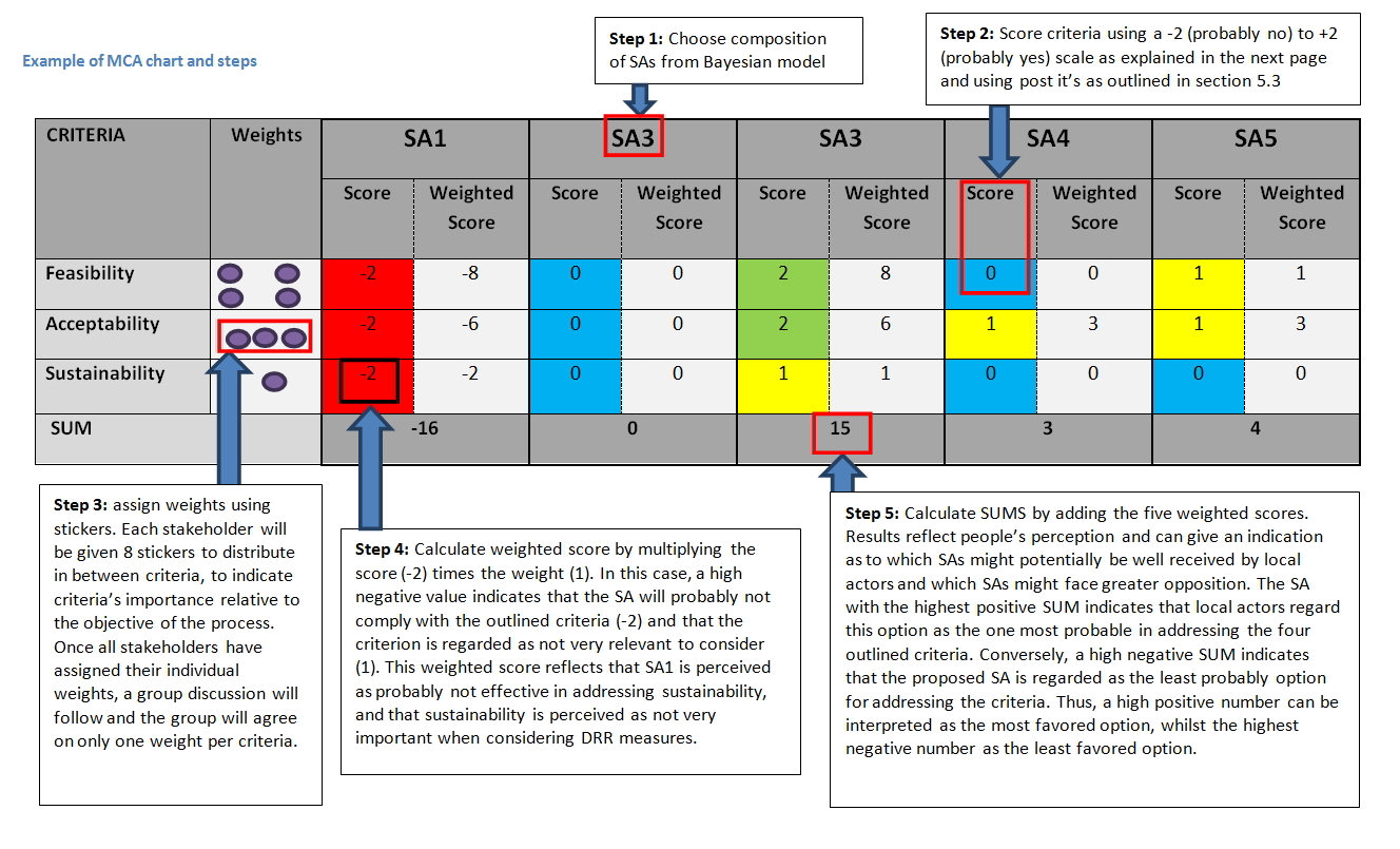 - Generate sums per measure by adding the weighted scores for all criteria per SA and entering the total value in the row titled “SUMS” at the end of the MCA Matrix. The SA will the highest weighted scores was stakeholders’ preferred alternative. Picture 1 shows an example of a complete MCA.