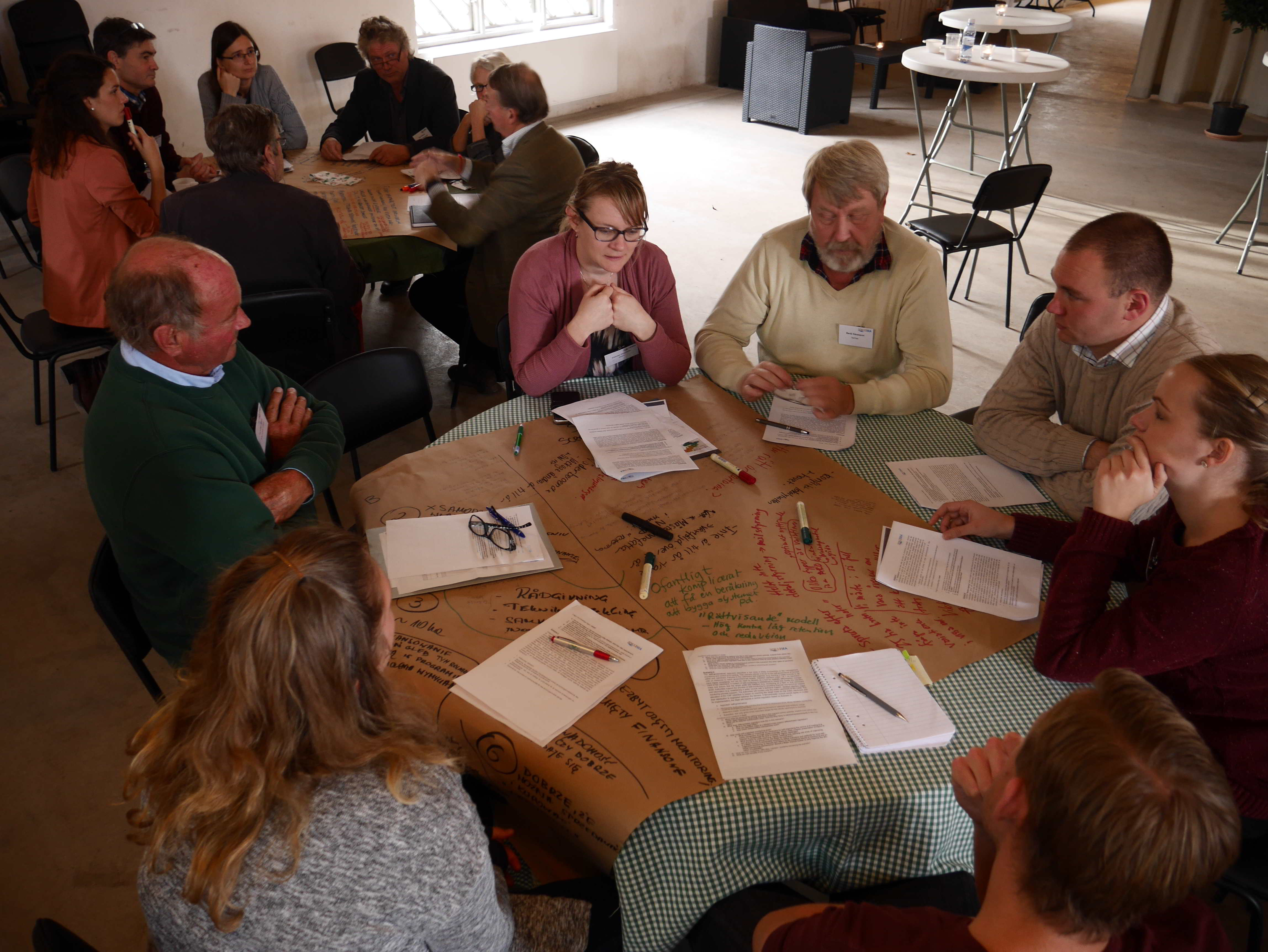 As one example of methods, the world café is described here in more detail. The World Café method is quite well established and its main aim is that people get in contact with each other, discuss and develop new ideas by the power of networking with a multitude of people. It can be used for strategic dialogue, multi-stakeholder engagement, multi-generational collaboration and cooperative action. Participants are seated on Café-style tables and are encouraged by the table host to write, doodle and draw key ideas on their tablecloths. Several rounds of the tables can be undertaken. Finally a period of sharing discoveries and insights in a whole group sums up the initiative.